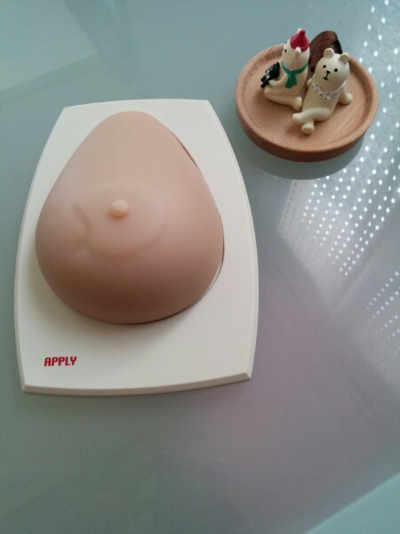現在の癌発生の状況や乳がんの基礎知識のレクチャーを受けた後、しこりのある胸のモデルを使いながらどこに癌があるのか探すのですが、一つはボコッとしていてすぐにわかるものの、あと数個がどうしても見つからず、ギブアップ・・・。
