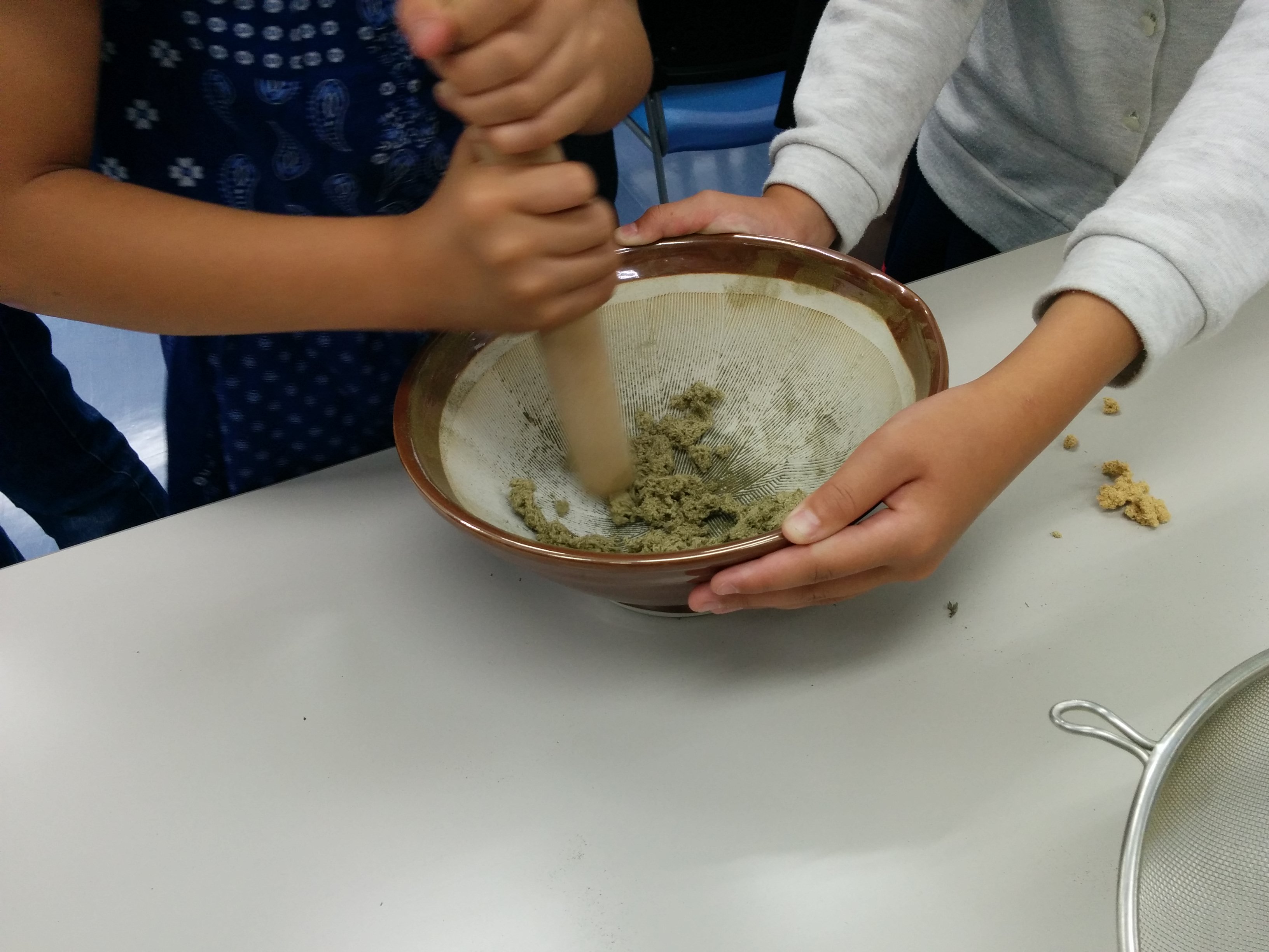 少しづつ繊維のようなものが出てきます。不純物を取り除きながらさらにゴリゴリすると、色も黄色がかった色に変化!