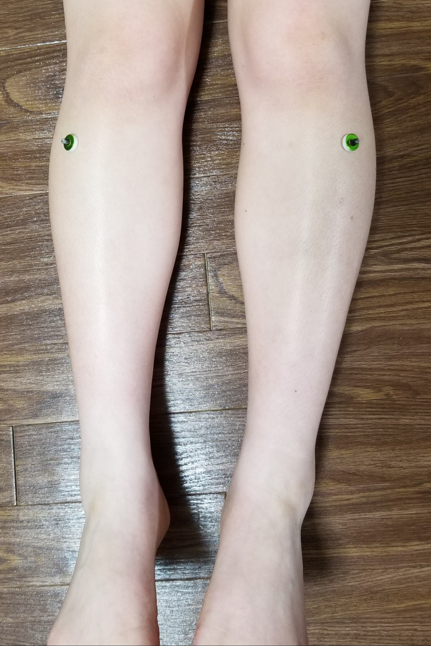 『ツボの場所』ヒザのお皿を親指と人差し指で囲うようにして触り、向うずねの外側で中指が当たる場所。